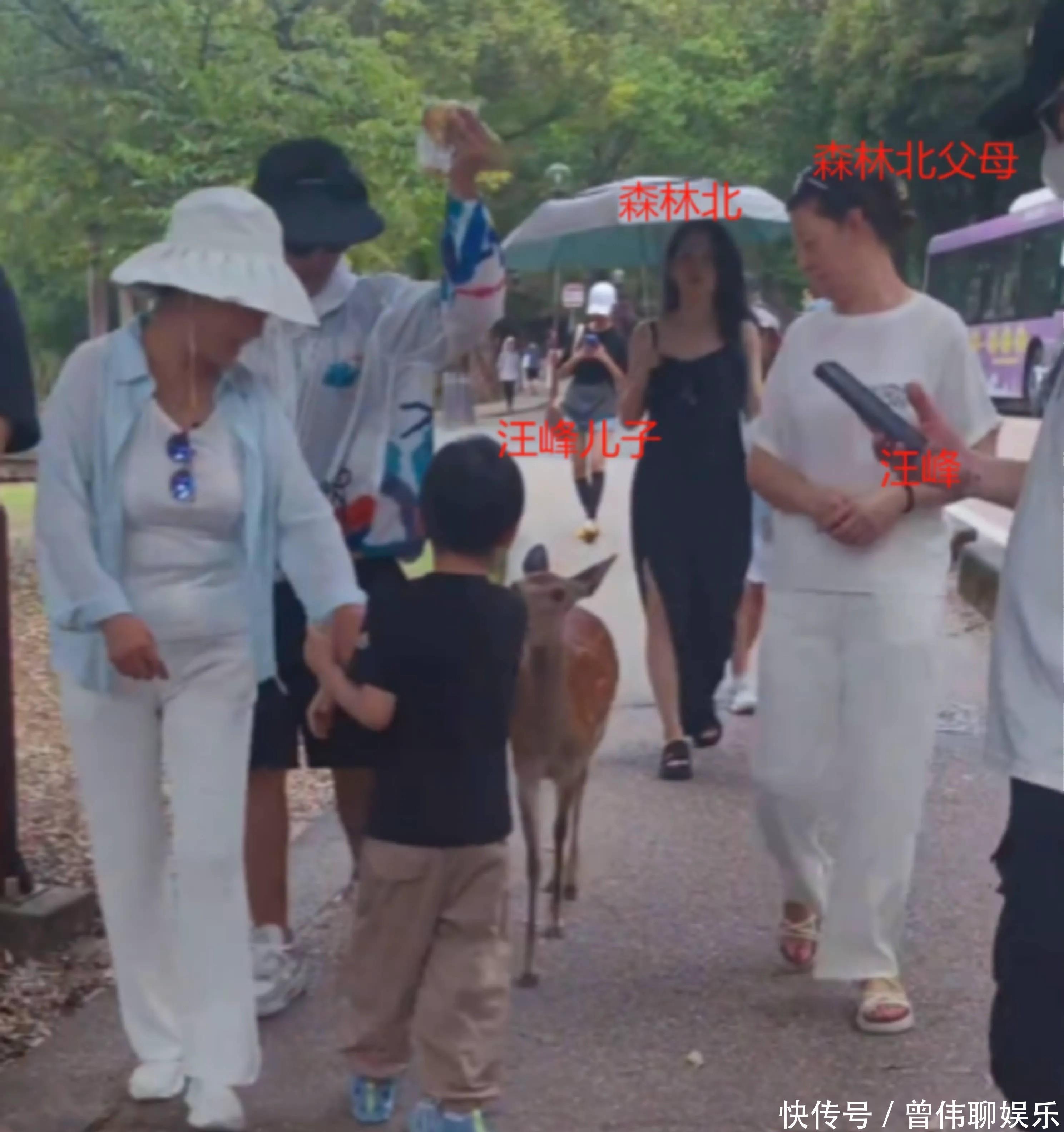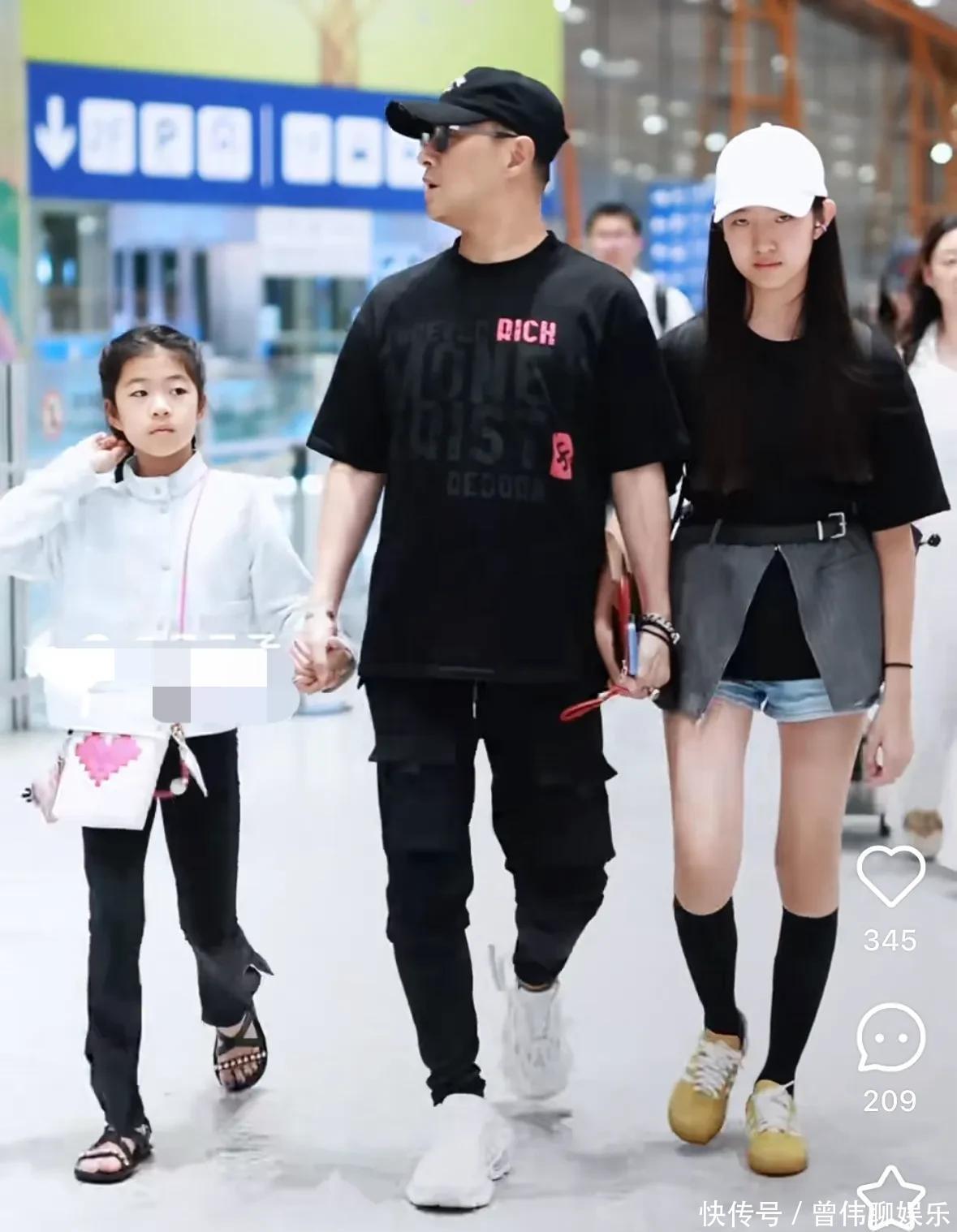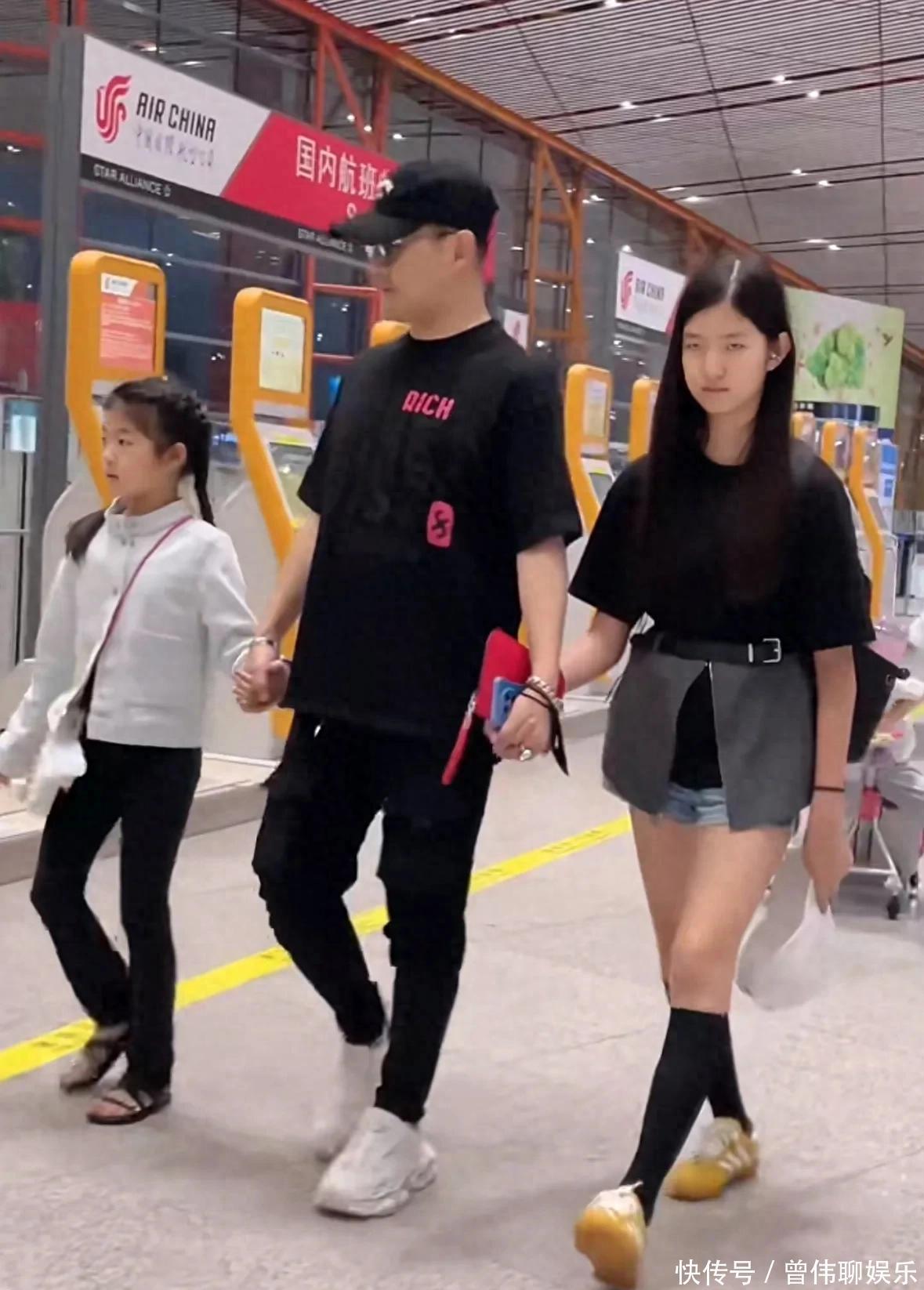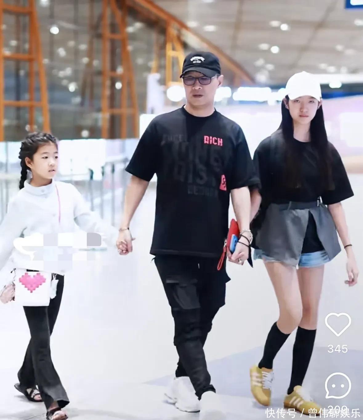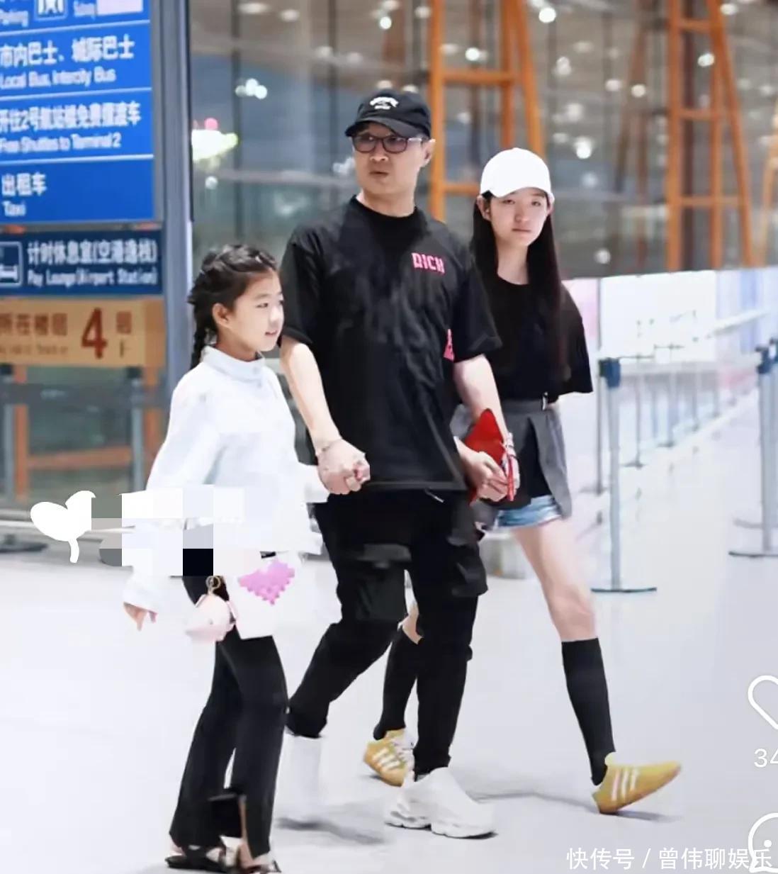 右手拉着和章子怡生的女儿醒醒,左手拉着和康作如生的二女儿汪憬怡,后头我方拉着行李箱的是和葛荟婕生的大女儿汪曼熙(小苹果)。