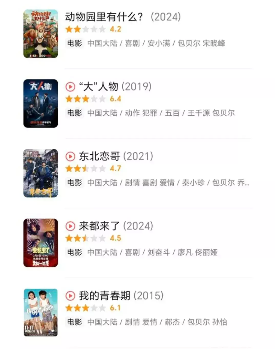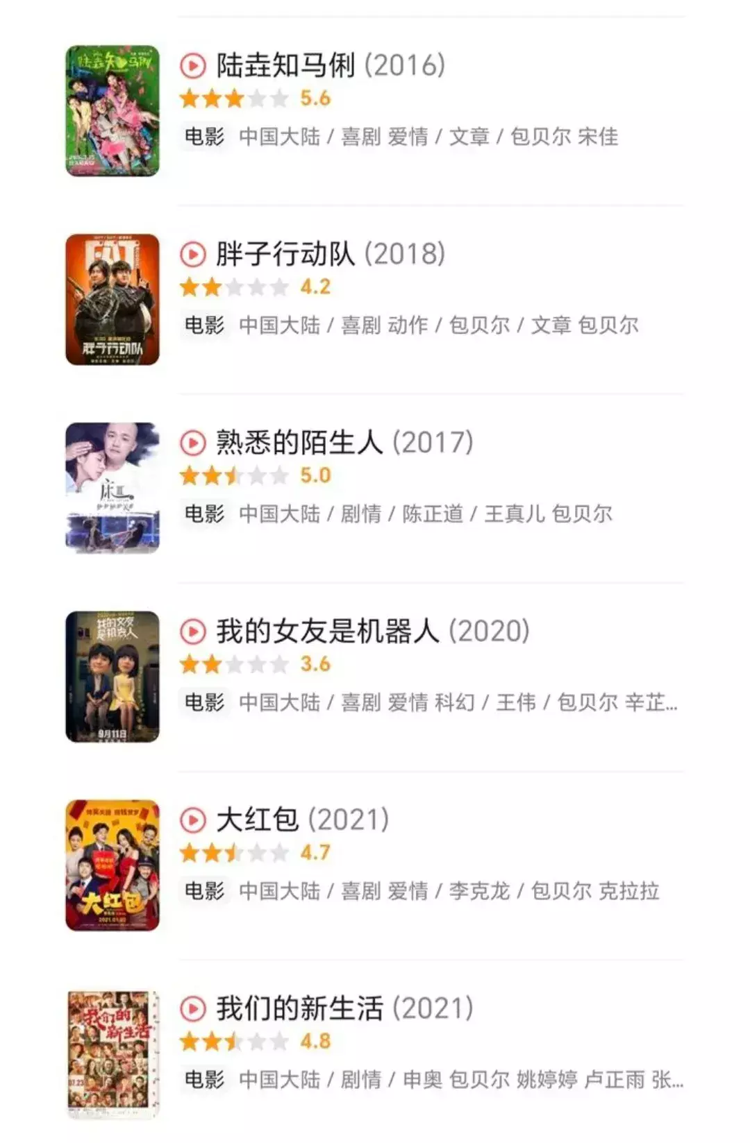 包贝尔的勤奋确乎有目共睹,这些年他拍摄了不少的电影,但短长常可惜,基本上每部齐被戴上了烂片的帽子,他现在主演的口碑最佳的一部电影《大东说念主物》,评分也才独一6.4,可见他的电影口碑有多无为。